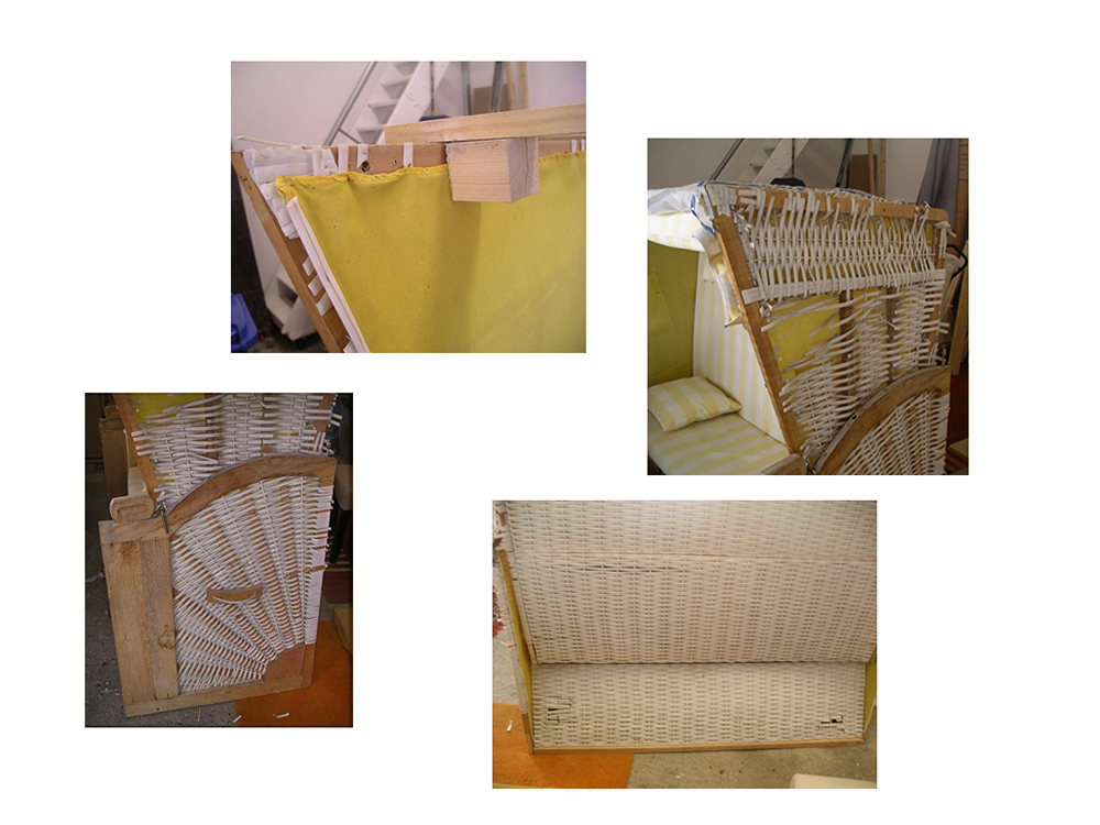 Frohgelaunt ging es ans Werk. Der Strandkorb wurde entkernt. Übrig blieben ein paar Holzteile, die abgeschliffen und manche Stellen neu verleimt wurden. Anschließend bekam das Holz einen neuen Anstrich 😉