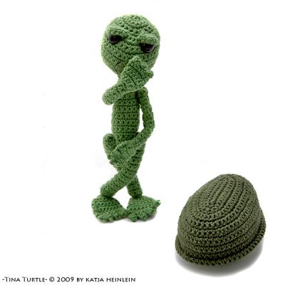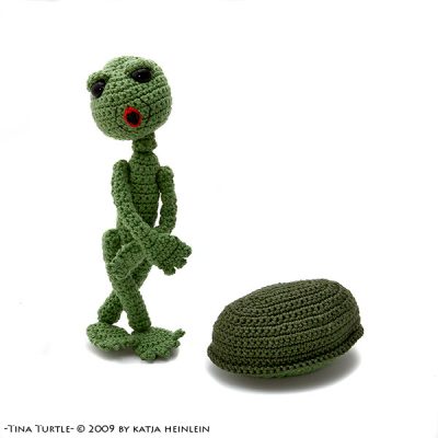 Bild, Text, Anleitung by Katja Heinlein Darf ich vorstellen: Tina Turtle, nackig und empört, dass ich ihr den Panzer nicht direkt angehäkelt habe. 🙂 Vielleicht ist ja jemand von euch so gnädig und häkelt ihr ein Kleidchen oder verändert den Panzer, so dass sie ihn mal eben überstreifen kann. Oder auch eine FKK Öte, die sich nicht so ziert wie Tina. Viel Spaß beim Nacharbeiten 🙂 Die Anleitung ist in Hin- und Rückrunden geschrieben, kann aber auch in Spiral gearbeitet werden. Man muss die Grundmaschen kennen, in Runden und ovalen Runden häkeln können. Ansonsten ist die Schildkröte relativ schnell