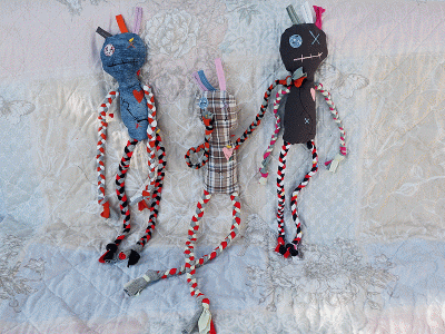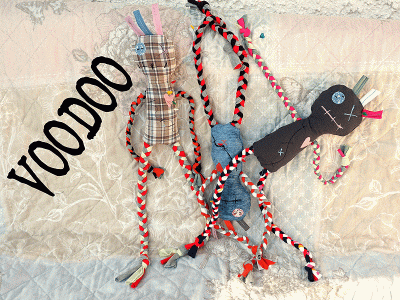 Text, Bilder, Anleitung by Katja Heinlein Eine witzige Voodoo Puppe, aus Jeans und Jerseyresten gearbeitet. Auch ein schönes Projekt für Kinder, sie können das Flechten übernehmen oder die Puppe mit Stoffmalstiften anmalen. Jede Puppe wird so zu einem kleinen Unikat. Und es macht Spaaaaaaaß. 🙂 Material: - Jeansreste oder alte Hemden für den Körper - alte T-Shirts oder Jerseyreste für die Arme und Beine - Schrägbänder o. Kordeln o. Jerseyreste für die Haare - Füllmaterial - Jeansnadel, Universalgarn - Schnittmuster Schnittmuster Voodoo Stiche: Dreifach-Geradstich: zum Zusammennähen ZickZackstich zum Applizieren Leiterstich / Matratzenstich: Schlussnaht Info: Diese