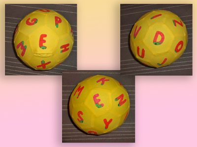 Bild und Text von Claudia G. Zu allererst habe ich das Fußballschnittmuster von Katja auf einen Karton übertragen und an den Ecken mittels Lochzange gleich eine Markierungshilfe geschaffen, sodass ich beim Anzeichnen die Punkte für die Naht setzen konnte. Ich habe 14 Fünfecke und 20 Sechsecke zugeschnitten, um eine Luftballonhülle (LuBaHü) daraus zu nähen. Ich wollte einen Buchstabenball haben, den ich quasi aus meiner Hosentasche bei Bedarf zaubern kann 😉 Um auf den ersten Blick zu erkennen wo bei den Buchstaben unten ist, habe ich aus einem Himbeerstoff (gab es mal bei IKEA) die Buchstaben so zugeschnitten, dass jeder