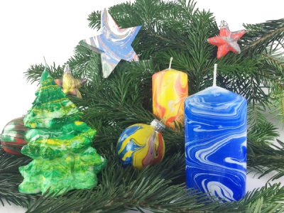 Lust auf bunte Weihnachten? Dann habe ich genau das Richtige für Euch. Ihr braucht Marmorierfarbe, ein paar Styroporkugeln, einen Eimer, einen Stab zum Verrühren der Farben und Handschuhe, damit ihr Euch nicht einsaut. Kinder können unter Aufsicht gerne auch mitmachen. Sie sollten jedoch zusätzlich Bastelbekleidung tragen. Zum Einfärben eignen sich Styropor oder Kerzen. Bei Glas oder Porzellan muss es fleckenfrei sein und selbst dann kann es passieren, dass die Farbe nicht gut haftet. In dem Fall die Farbe abschruppen und ggf. das Material anrauen oder grundieren. So funktioniert es: einen Eimer mit Wasser füllen, dann die Farben nach Packungsanleitung