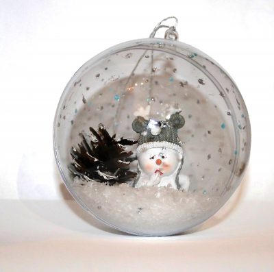 Text und Bild von Gaby Borchers Schnell und einfach gemacht: eine Acrylkugel nehmen, auf die oberen Hälften habe ich mit Glitzerkleber den Schnee gemacht, die Spitzen von einem Tannenzapfen mit weißer Farbe betupft und den süßen Schneemann hab ich gekauft. Tannenzapfen sowie Schneemann habe ich mit Klebegummi befestigt. Ach ja, ein Tütchen Deko Schnee braucht man noch oder grobes Salz. Und schon ist die Dekokugel fertig.